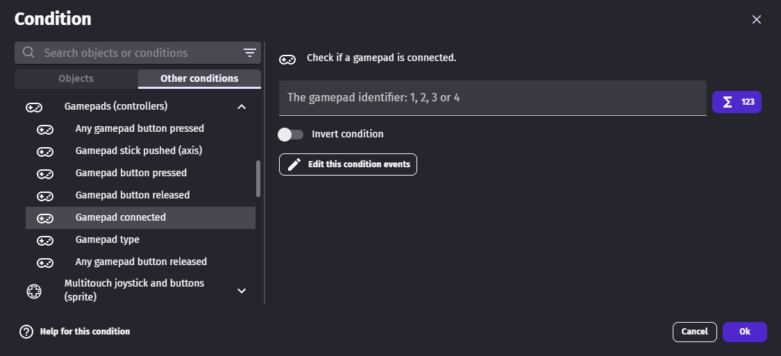 • If your game is multi player, it's a good idea to use the Gamepad connected condition to check which gamepads are connected. You could store in a variable the gamepad number associated to a player. You can also force the first player to use the Gamepad 1, and the other player to use Gamepad 2.