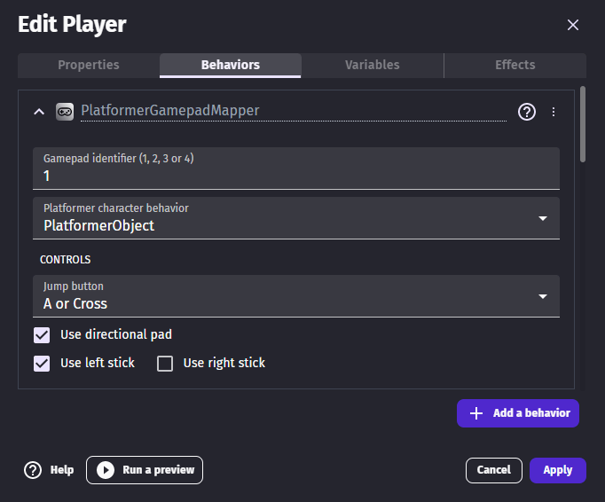 The "3D platformer gamepad mapper" behavior can be added to a 3d physics character to make the character move according to player inputs automatically.