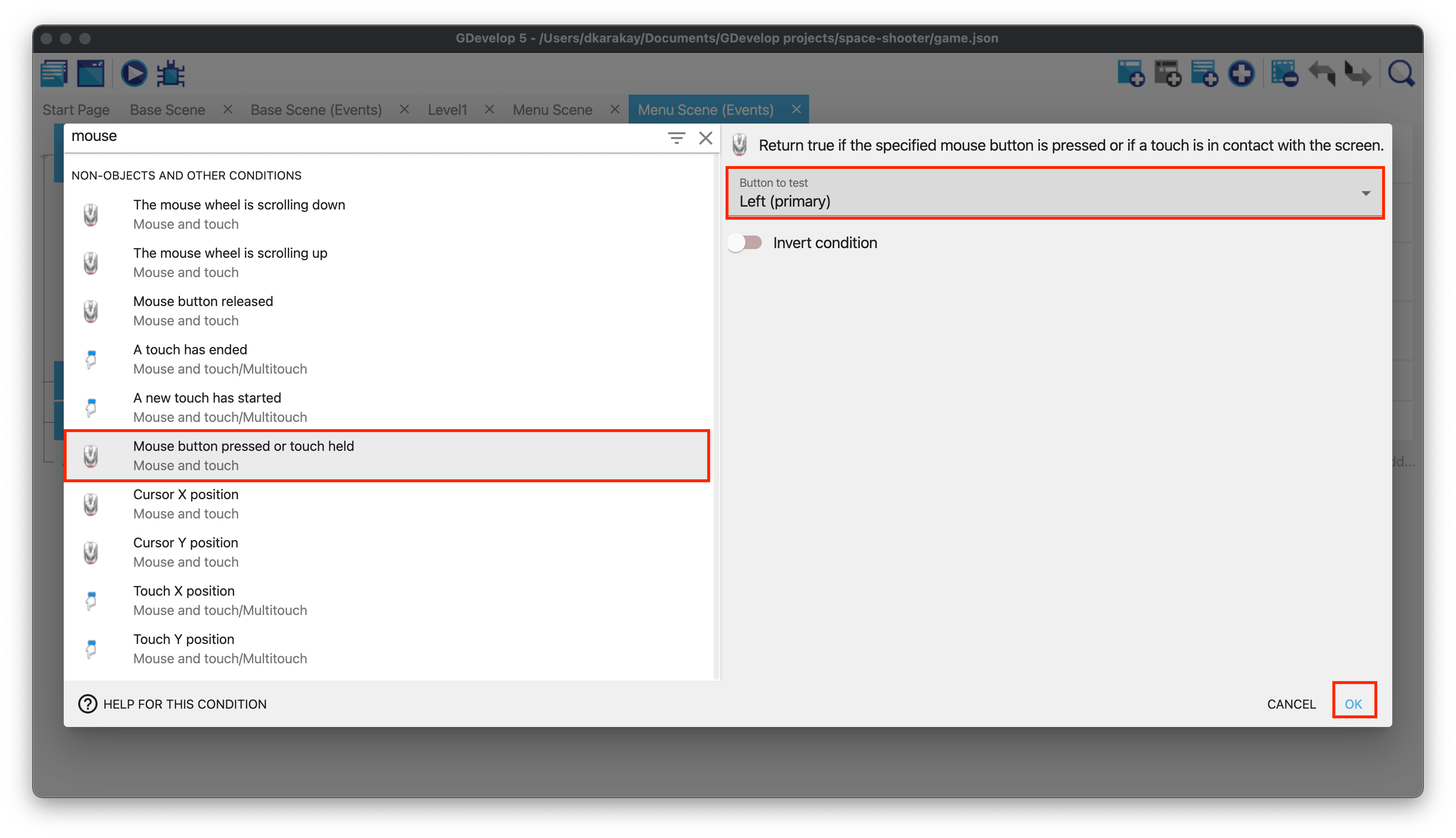 Then, add a sub-event. Choose Level1, and select The cursor/touch is on the object option.